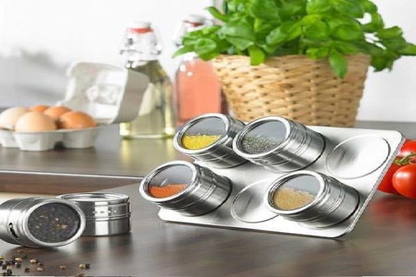Những lọ đựng gia vị bằng thép không han gỉ có gắn nam châm sẽ giúp bạn dành dụm được khoảng không ngăn bếp. Bằng phương pháp xếp chúng lại giáp cạnh nhau, chúng sẽ vương nhau và bạn không nhất thiết hao nhiều thời gian để khôn khéo sắp đặt những lọ gia vị cho ngăn nắp sau cứ mỗi lần nấu thưởng thức.
